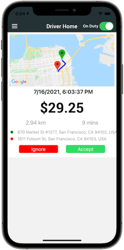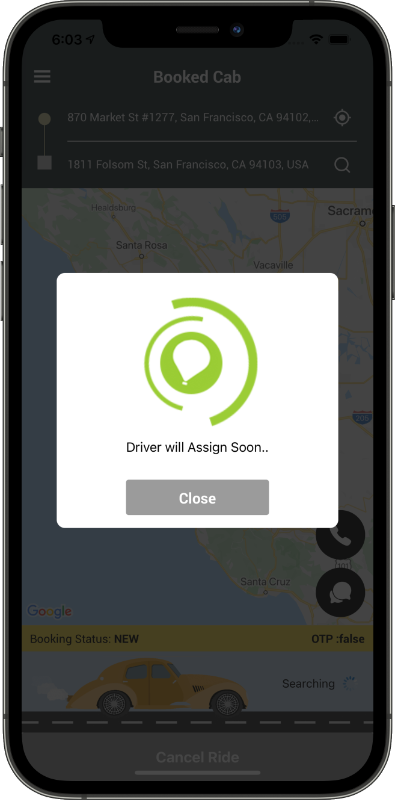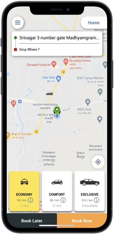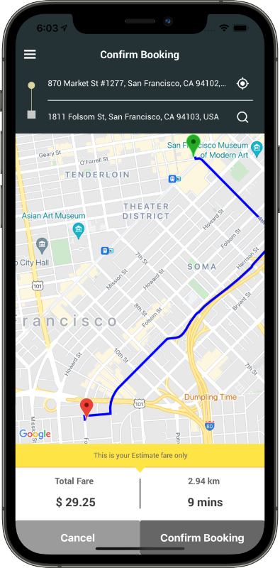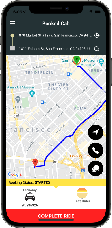 - Approche basée sur la carte – Faites glisser la carte pour sélectionner l’adresse ou utilisez la saisie semi-automatique soutenue par les API Google. Suivi complet des véhicules sur la carte. Les API Google sont également utilisées pour calculer le temps et les distances pour les estimations.