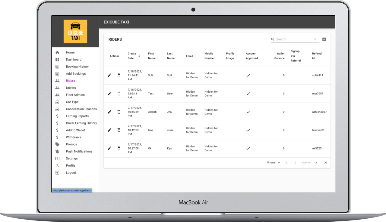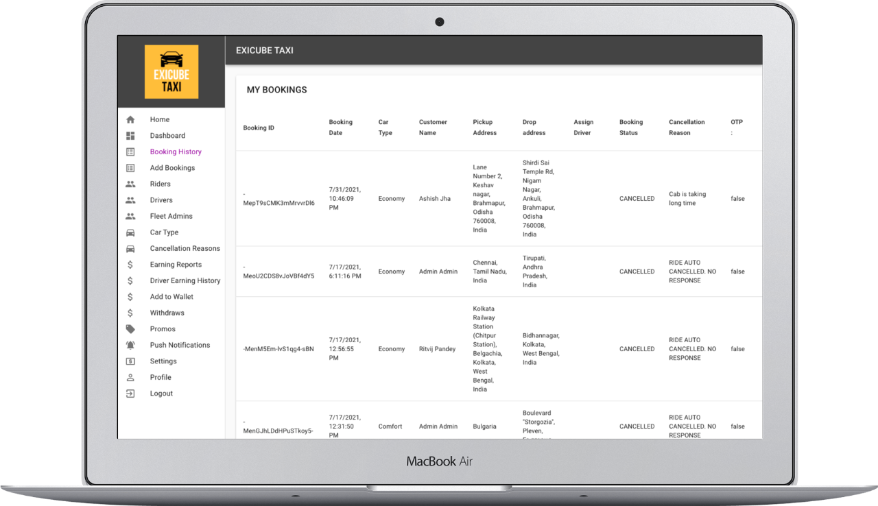 - Gestion des utilisateurs – L’administrateur peut ajouter, modifier, supprimer les 3 types d’utilisateurs, clients, chauffeurs et administrateurs de flotte. L’administrateur peut approuver le pilote et également réinitialiser le statut Occupé des pilotes.